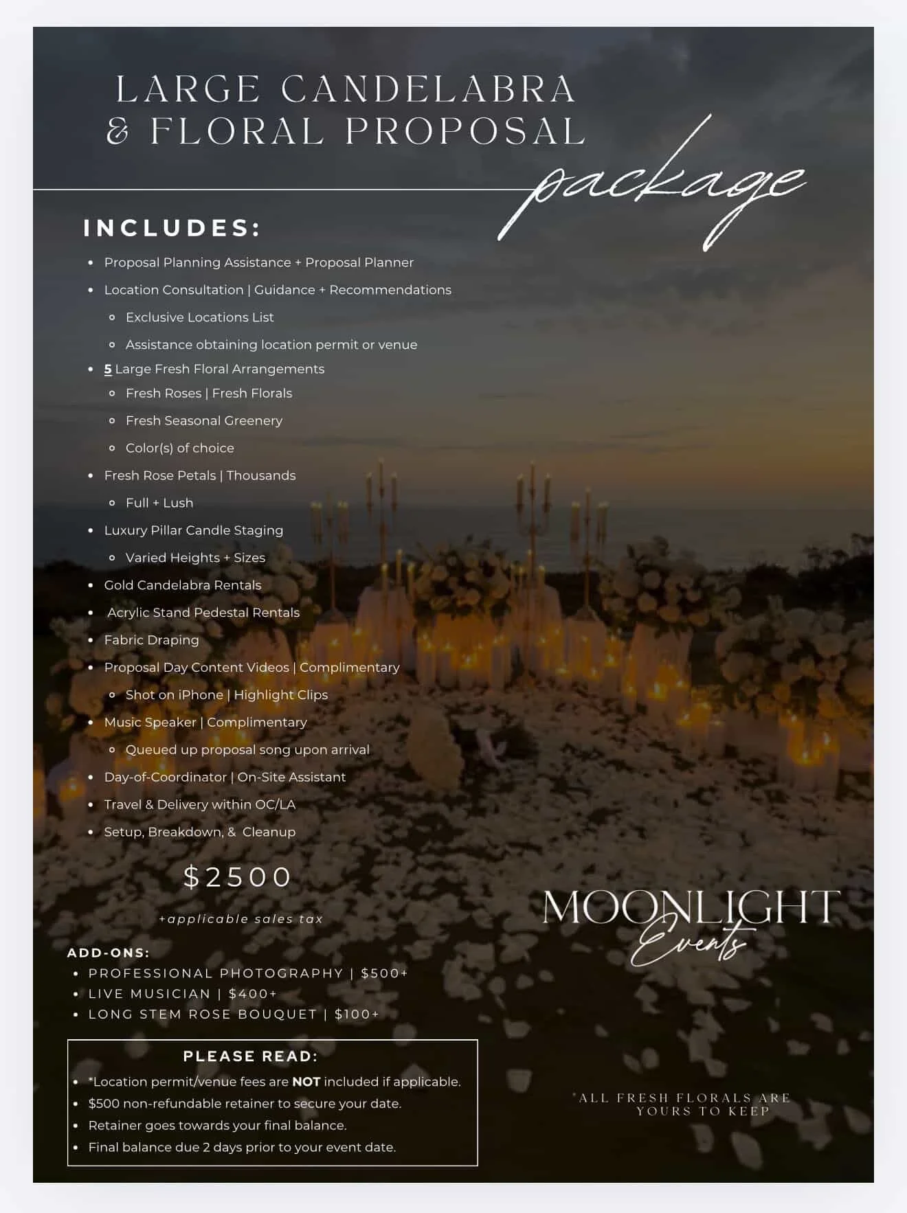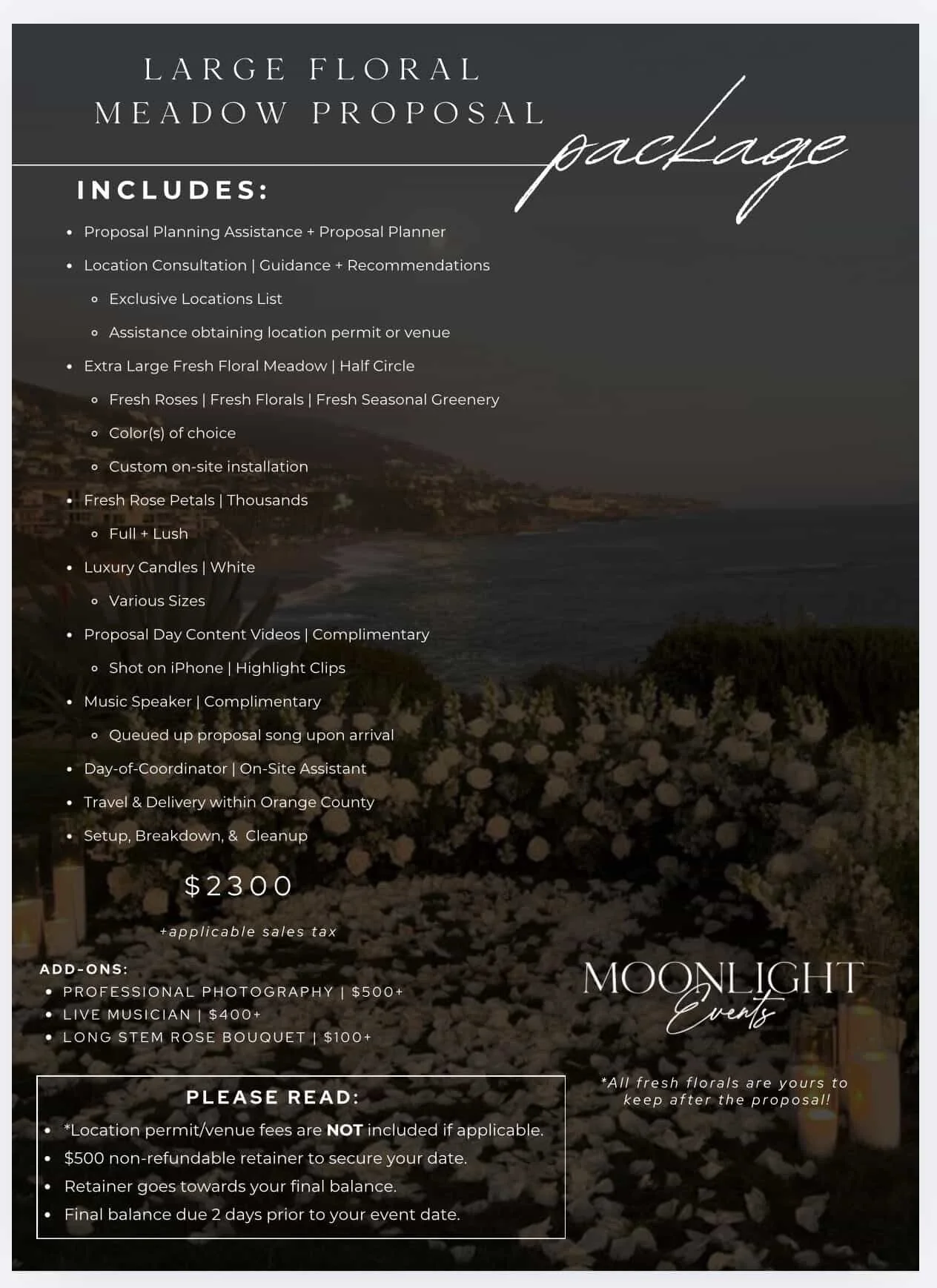 Moonlight events coordinate romantic proposals tailored to you. The videos above are two designs that were produced in Los Angeles. Below is the pricing for their services.